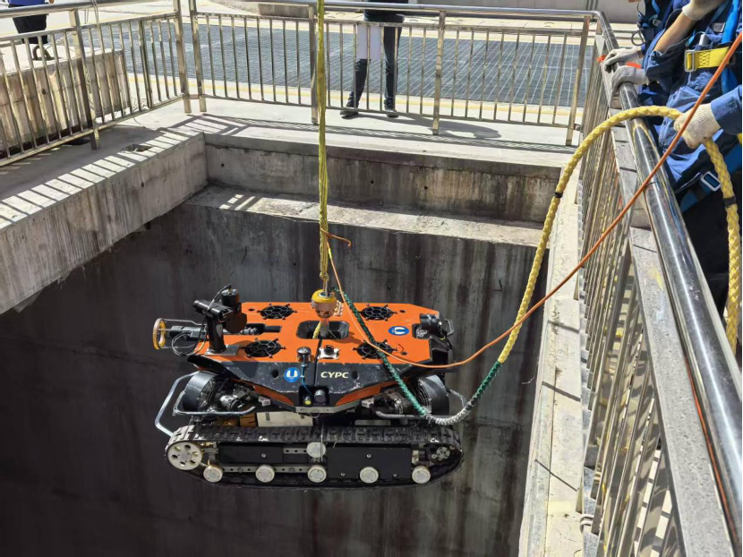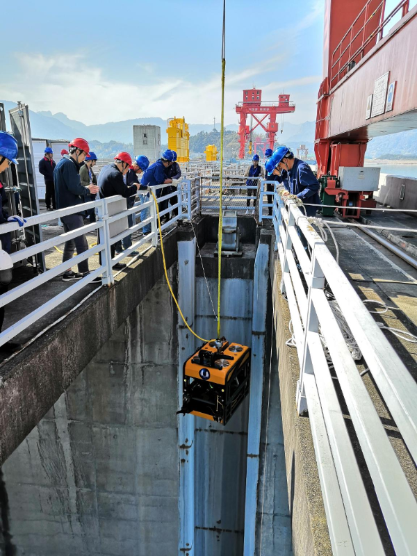 ▲ 450米纜水下機器人在三峽電站機組進水口準備入水開展檢查